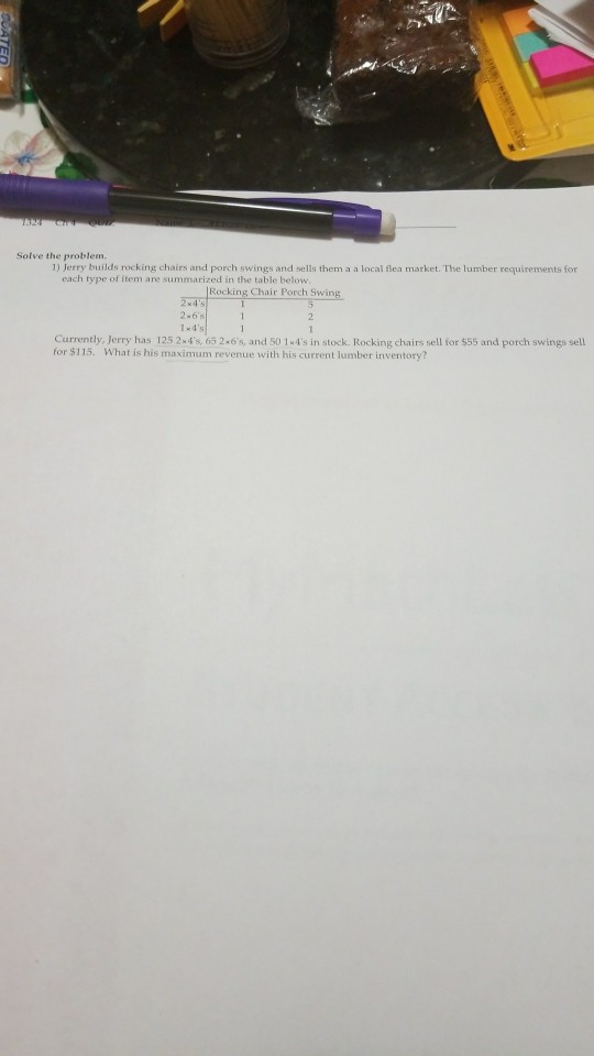 Jerry builds rocking chairs and porch swings. The lumber requirements for each type of item are summarized in the. Solve the problemJerry builds rocking chairs and porch swings and sells them a a local flea market. Solve the problemJerry builds rocking chairs and porch swings and sells them a a local flea market.